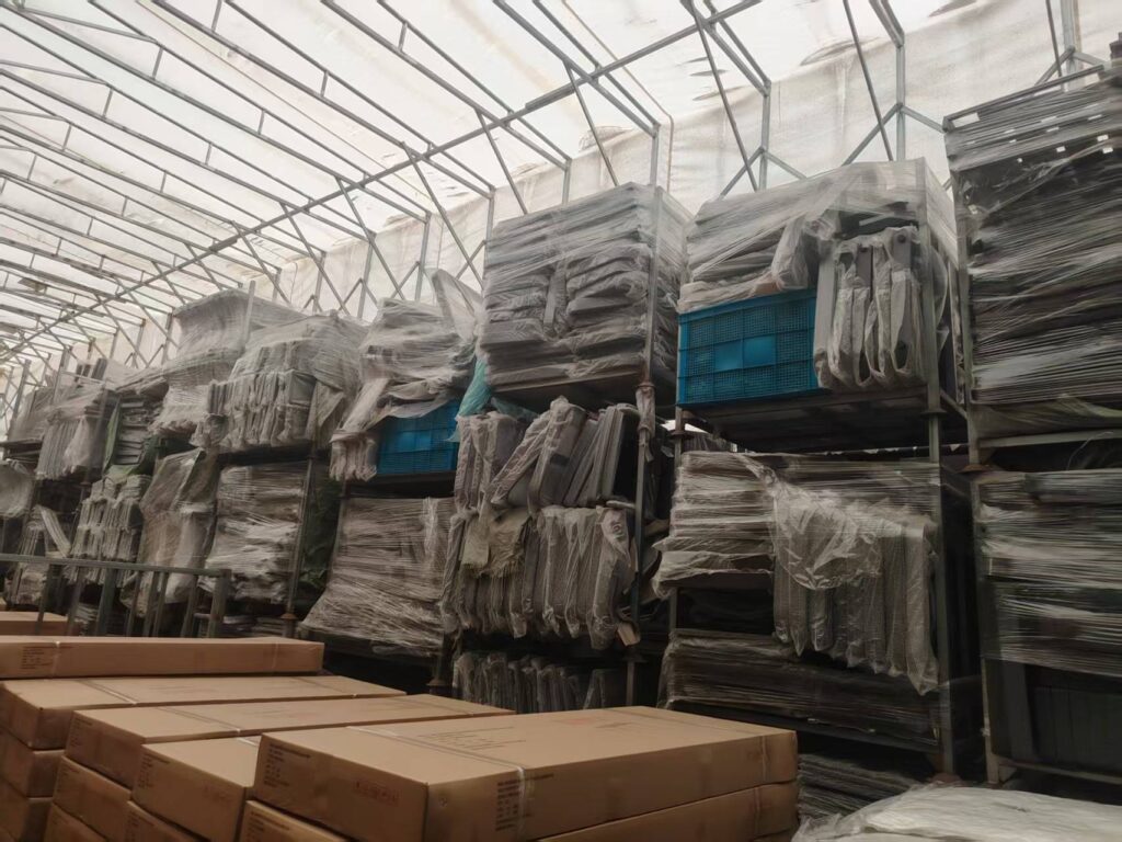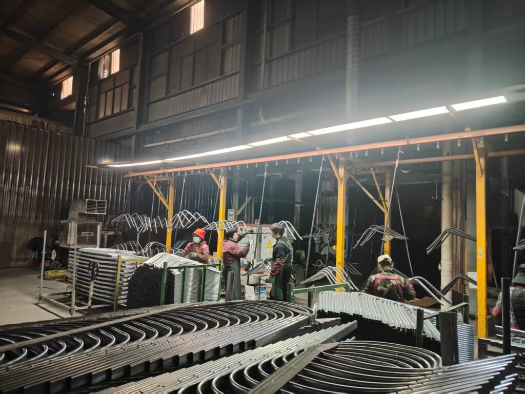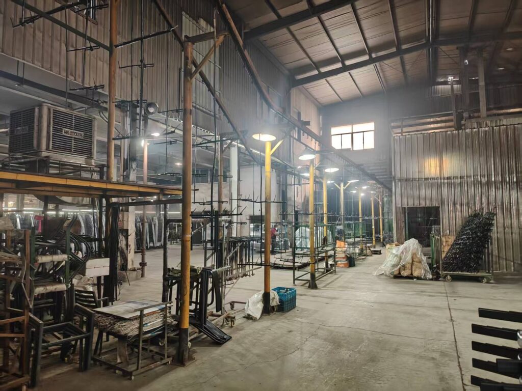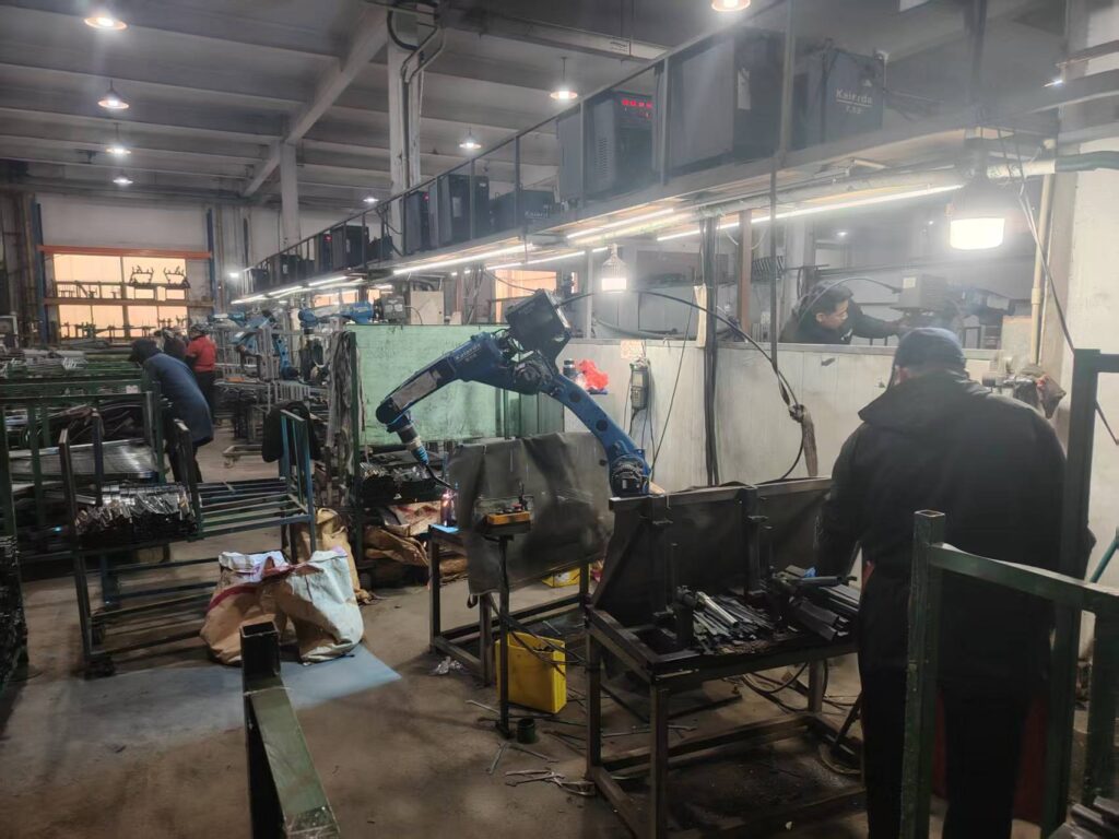 Production Process: "Equipped with automatic robot welding arms, advanced powder coating lines (essential for rust resistance), and rigorous QC testing."